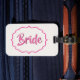 Rosa-etikett bagagemärke för Bride! rosa och svart text.