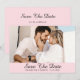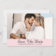 Fotot för elegant bröllop sparar datumkorten med ett förlovning-foto och ett skript på rosa-bakgrund. Personlig rosa bröllop spara datum-kort. Anpassadets kort för rosa bröllop spara datum. Skriptkort i bröllop spara datum.