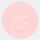 Ordna dina inbjudningskomponenter i bröllop spara datum med dessa runda klistermärken som har ett färg i rosa och ett vitt, stiliserat skript. Anpassa dina klistermärken genom att byta ut namn och bröllop mot dina egna. Välj från projektionsyta eller glansig stil.