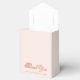 En rosa presentask till en bröllop med rosa och roséguld bröllopsfärger. På klaffen finns en roséguld vapensköld med en Regency-dams profil siluett i.