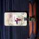 En personlig bagagetikett med en elegant rosa magenta fjäril med lila accenter. En vit ram med en guldfärgad kant är lagrad överst på en shabby vintage collage med rosa rosor och andra dekorativa element. En chic gammaldags känsla.
