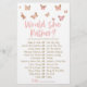 Det här är en Skulle hon hellre? Möhippans spel. *Skulle hon hellre? - Briden kommer att fylla i sitt eget personliga svar lakan. Gästerna kommer att ringa in det rätta alternativet med tanke på sina egna personliga kunskaper om bruden. Den som får de rätta svaren vinner! Spelet består av en rosa-fjäril, roligt möhippa-spel