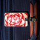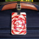 med originalkonstform från vattenfärgsmålning av ljus rosa och röd kamellablomma. Den här designen visar blommönstret i stort, nära fokus, på stil och får det botaniska subjektens petaler att framstå som abstrakt. Färg är mycket ljust, contemporary och vibrerande. Den här bagagetaggen kan anpassas på baksidan så att den innehåller dina personuppgifter.