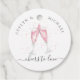 Festiva och eleganta förmånsetiketter för din förlovningsfest, repetitionsmiddag eller bröllop med ett par champagneglas som klingar i vattenfärg, fyllda med rosa bubbel. Anpassa med två rader anpassad text nedan; visas med "skål för kärlek" och parets namn.