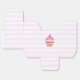 Rosa cuptårtlåda med körsbär, strimlad rosa bakgrund.