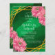 En delikat vattenfärgsillustration med ett guld-geometriskt ram inställt mot en bakgrundsbild av grönten. Ram är förtjust i de pulserande shock rosa krysantemum som placeras längs yttre kant. Hela designen har en mjuk vattenfärg struktur, som blandar elegans med en naturlig blommigt.