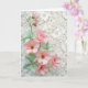 Fintvätt av rosa blommor med grönt löv sträcker sig på ett elegant sätt över en helt mönstrad vit snöre-bakgrund, vilket skapar en harmonisk blandning av natur och konst. Inuti text kan du ändra.