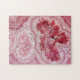 Rosa och vita kristaller och band i detta fotografi av ett geode.