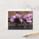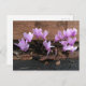 Vykort med foto av rosa-cyklamen hederifolium-blommor i hösten.