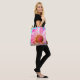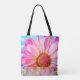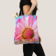 En ljus rosa daisy mot en ljusblå bakgrund. Grund på tallriken är utpekad med en vatten-färg-polka-punkt mönster.