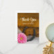 Skriva ett tacksamhets- och uppskattningsbudskap för gåvor som tas emot efter gården på landsbygden stil eller temat förlovning lada party, möhippa eller giftermål med Daisyn för Rosa av rustik chic och Horseshoe Land Western Bröllop Tackkort . Dessa avslappnader, som ändå har klassmässig anpassningsbar, har ett tackkort med en blommigt av en blommar av rosa gerber daisy-blomma, rostigt hästskon och en vit möhippa med en vättad daglig bakgrund av barrträ.