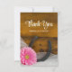 Skriva ett tacksamhets- och uppskattningsbudskap för gåvor som tas emot efter gården på landsbygden stil eller temat förlovning lada party, möhippa eller giftermål med Daisyn för Rosa av rustik chic och Horseshoe Land Western Bröllop Tackkort . Dessa avslappnader, som ändå har klassmässig anpassningsbar, har ett tackkort med en blommigt av en blommar av rosa gerber daisy-blomma, rostigt hästskon och en vit möhippa med en vättad daglig bakgrund av barrträ.
