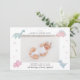 Kort för utsänt födelsemeddelande med foto av ditt nyfödda barn med illustration av rosa dinosaurier.
