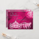 Personliga, eleganta skräddarsydda spanska Sweet 16 födelsedagsfestinbjudningar för flickor. Vackra rosa dubbelsidiga Sweet Sixteen-inbjudningar för tonårsflickor med en funky retro diskokula och glamourös tryckt bild med rhinsten glitter, glitter, paljetter och juveler, en kunglig prinsessvagn / vagn med krona / tiara och hästar på en vibrerande rosa och vit ljus och gnistrande bakgrund. Det finns en vacker musikalisk not och höga klackar stiletto sko / glasskoskosnabel på baksidan av inbjudningarna. Magiska, snygga, klassiska, söta, kvinnliga, moderna inbjudningar med trendiga, fashionabla färger. Dessa groovy, stiliga, sofistikerade, söta inb