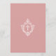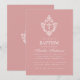 Denna eleganta dammiga rosa och vita dopinbjudan med vintage-känsla, rekommenderas för en flicka, har en gammal blomsterprydd vapensköld med ett kors i, båda vita. Barnets namn är skrivet med ett elegant kalligrafiskt typsnitt. All text är vit och kan anpassas. Bakgrunden är dammig rosa, en modern nyans av rosa.