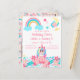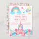 Den här flickiga och söta födelsedagsinbjudan är perfekt för din unga flicka. Den har handritade söta illustrationer som en enhörning som sitter på en säng av blommor, en färgglad regnbåge på himlen, stjärnfall och en måne med moln på vit bakgrund. På baksidan finns ett mönster av alla komponenter på en rosafärgad bakgrund. Färgpaletten inkluderar gult, turkosgrönt, ljust blått, rosa, lila och orange. Det är en söt, modern och magisk födelseinbjudan fylld med mytiska, lekfulla och roliga element. Bakgrundsfärgerna och all information, inklusive ålder, kan ändras under anpassningsalternativen.