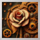 Diseño único de una rosa delicada rodeada de engranajes mecánicos antiguos, fusionando naturaleza y tecnología con un elegante toque steampunk.