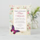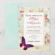 En vacker bröllopsinbjudan med en elegant rosa magenta fjäril med lila accenter. En vit ram med en guldfärgad kant är skiktad över en shabby vintage collage med rosa rosor och andra dekorativa element. En chic gammaldags känsla.