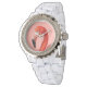 Flamingo ansikte, vit armbandsur för kvinnor med rinestoner, eller välj en annan stil-klocka. En koral rosa-orange flamingo nacke och ansikte tryckt över en ljusare rosa bakgrund. Smaklig rhinestoner cirkelformar den vackert centrerade bilden.