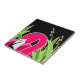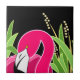Abstrakt-stiliserad flamingofågel på svart bakgrund omgiven av dekorativt löv