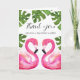 Rosa flamingo, strand, grönt löv, tropisk vattenfärg Tack. Elegant, enkel kalligrafi. Unik, handmålad grafik av flamingo av konstnären Monika Howarth. Perfekt för ett Bröllop.