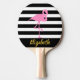 En rosa flamingo visas på pingpongpaddeln med svart och vitt rand. Du kan anpassa pingpongpaddeln med ditt namn vid grund i faux-skript (inte folie) i guld.