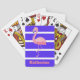 Roligt som leker kort med en rosa flamingo på en blått, görade randig bakgrund. Personifiera med ditt namn!