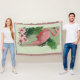 En rosa flamingo med tropiska löv och rosa av grönt lever i ett ljust rosa sammanhang