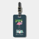 En bagagetong med illustration av en rosa flamingo som står på en säng av blommigt blommor med självkulerande blommor där grönt handflatan träd svävar i ryggen. Tropiskt och söt. Bakgrunden är mörk blått.