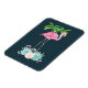 Magnet med en illustration av en rosa flamingo som står på en säng av blommigt blommor med självkulerande blommor där grönt handflatan träd svävar i ryggen. Tropiskt och söt. Bakgrunden är mörk blått.
