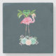 En sten underlägg med en illustration av en rosa flamingo som står på en säng av blommigt blommor med kula blommor med grönt handflatan träd som sviktar i ryggen. Tropiskt och söt. Bakgrunden är mörk blått.