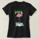 En t-shirt med en illustration av en rosa flamingo som står på en säng av blommigt blommor med kula blommor med grönt handflatan träd som sviktar i ryggen. Tropiskt och söt.