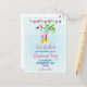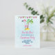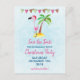 Spara vykortet Date christmas party. En söt illustration av en rosa flamingo som bär en röd julhatt. Stå på ett sandberg med ett tropiskt handflatan träd efter. Rosa och grönt buntbanderoll längs överkanten och ställ in en ljusblå bakgrund.