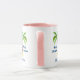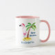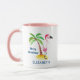 Personlig mugg med en söt illustration av en rosa flamingo med en röd julhatt. Stå på ett sandberg med ett tropiskt handflatan träd bakom. perfekt för en tropisk julmassa.