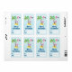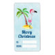 En presentetikett med utrymme att skriva in från- och till-namn. En fantasifull teckning av en rosa flamingo som bär en röd jultomtehatt. Står på en hög av gul sand med ett grönt och brunt kokospalmträd i bakgrunden. Ljusblå bakgrund med ett svagt polygont mönster. Söt och rolig festlig tropisk design.