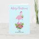 Ett julkort med ett tropiskt temat julflamingo med en rosa julhatt. Under fötterna är en candy cane bouquet med tropiska blommor och rosa söt. En myrsprit på bröstet.