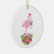 Ett prydnadsföremål med ett tropiskt tema: julflamingo med en rosa julhatt. Under fötterna är en candy cane bouquet med tropiska blommor och rosa söt. En myrsprit på bröstet.