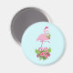 En magnet med ett tropiskt tema julflamingo med en rosa julhatt. Under fötterna är en candy cane bouquet med tropiska blommor och rosa söt. En myrsprit på bröstet.