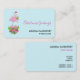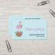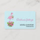 Affärskort med ett tropiskt tema: julflamingo med en rosa julhatt. Under fötterna är en candy cane bouquet med tropiska blommor och rosa söt. En myrsprit på bröstet.