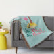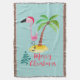Kasta filten med en söt illustration av en rosa flamingo i en röd tomhatt. Stå bredvid en grönt handflatan träd på en massa gult sand. Ett julgran-utkast från finare snabbt placeras bredvid texten God jul. Skriven i rosan färg i ett handskrivet teckensnitt i finare. Bakgrund till Pastel grönt.