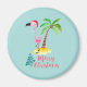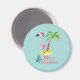 Festiv magnet med en söt illustration av en rosa flamingo i en röd tomhatt. Stå bredvid en grönt handflatan träd på en massa gult sand. Ett julgran-utkast från finare snabbt placeras bredvid texten God jul. Skriven i rosan färg i ett handskrivet teckensnitt i finare. Bakgrund till Pastel grönt.