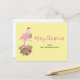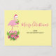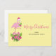 Julkort med en tropiskt tematiserad julflamingo som bär rosa tomteluva. Under fötterna finns en bukett med sockerrör och vackra tropiska blommor och rosa bär. En liten gren julgransslingor på bröstet.