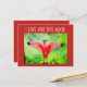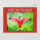 Det här röda vykortet har en vattenfärg på en rosa flamingo med vingar utdragen för att säga: "I kärlek dig så mycket!"