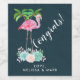 Gratulerara etiketten för vin flaska med en illustration av en rosa flamingo som står på en bädd av blommigt blommor med blomning, där grönt träd i handflatan i ryggen sväller in. Tropiskt och söt. Bakgrunden är mörk blått.