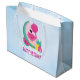 Gåsväska med en söt illustration av en rosa flamingo med några vattenmeloner och ananas. Systemet för rosa och grönt färg. Summery och tropisk. Bakgrunden är en ljusblå vattenfärgsbild.