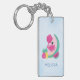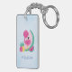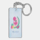 Personligens akrylnyckelkedja är en söt illustration av en rosa flamingo med några vattenmeloner och ananas. Systemet för rosa och grönt färg. Summery och tropisk. Ljusblå bakgrund.