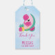 Ett tack från party till er märkre med en söt illustration av en rosa flamingo med några vattenmeloner och ananas. Systemet för rosa och grönt färg. Summery och tropisk. Bakgrunden är ljusblå.