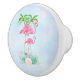 En keramisk dörrknapp med en illustration av en mamma och baby rosa flamingo som står på en säng av blommigt blommor med kula blommor där grönt handflatan träd sväller in i baksidan. Tropiskt och söt. Bakgrunden är en halvljusblå vattenfärg med lilans ledtoner.