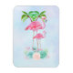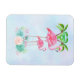 Magnet med en illustration av att en mamma och baby rosa flamingo står på en bädd av blommigt blommor med blomning och att grönt handflatan träd sväller i ryggen. Tropiskt och söt. Bakgrunden är ljusblå.
