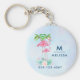 Personlig i nyckelkedjan med namn, ursprungligt och mobilt nummer. Designad med en illustration av att en mamma och baby rosa flamingo står på en säng av blommigt blommor med kula blommor med grönt handflatan träd i ryggen. Tropiskt och söt. Bakgrunden är en halvljusblå vattenfärg med lilans ledtoner.